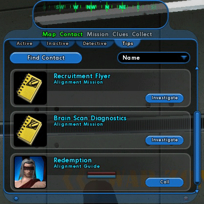 In this screenshot, I have two Tip missions ready to play, plus the contact named Redemption, who is, as it says on the window, the "Alignment Guide".