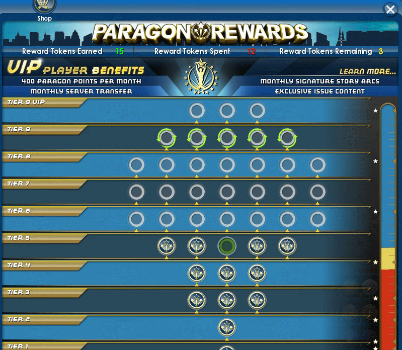 Not only does CoH reward players through double-XP weekends, new issue releases, and other special events, but you also get bonuses for how long you've played. Paragon Rewards is the new system for rewarding players, which has taken over from the older Veteran Rewards program which gave special gifts to players after every three months of playtime.